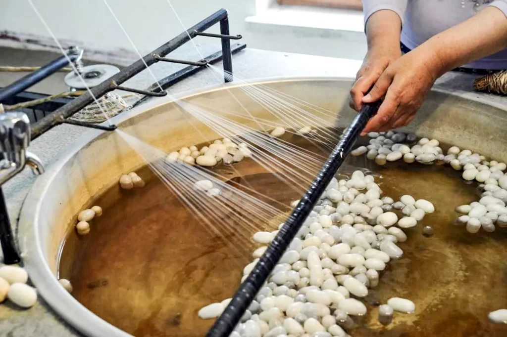 После сбора коконы подвергаются обработке. Их помещают в горячую воду, чтобы размягчить структуру и облегчить разматывание нити. Этот процесс называется “размотка коконов”. Размотка требует высокого мастерства и терпения, так как необходимо не повредить нить, а получить её максимально целостной.